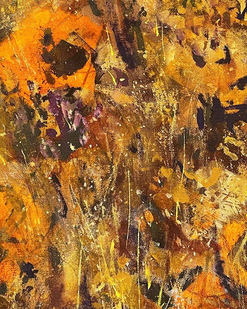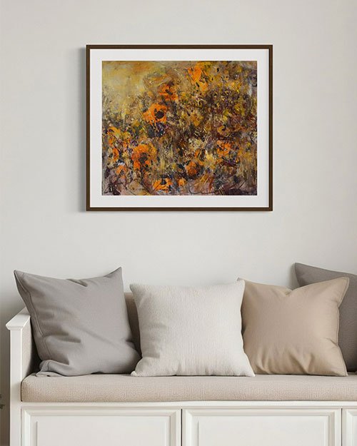 Pintura figurativa de paisaje florido arropado por los tonos cálidos del final de la tarde.