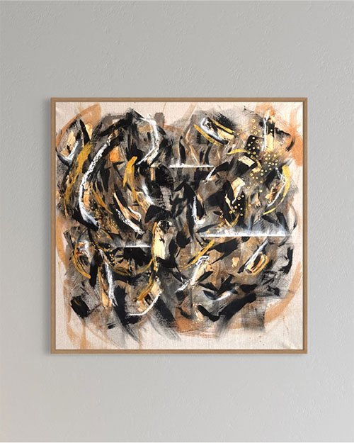 Pintura abstracta con colores neutros y dorado. uso de óxido sobre lienzo crudo. superposición de pinceladas.